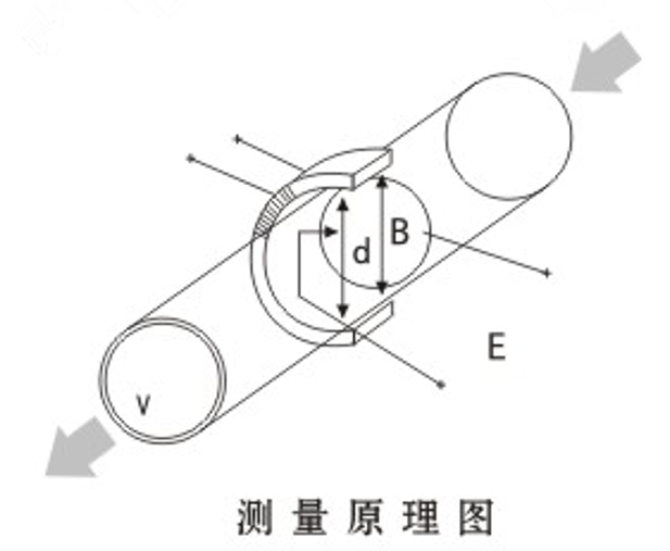 測量流量時(shí),導(dǎo)電性液體以流速V流過垂直干流動(dòng)方向的磁場,導(dǎo)電性液體的流動(dòng)感應(yīng)出一個(gè)與平均流速成正比的電壓,其感應(yīng)電壓信號(hào)通過與液體直接接觸的電極檢出。對(duì)于同一流量計(jì)S. B. d為常量,所以流量與感應(yīng)電動(dòng)勢E(或流速V)的大小成正比。